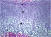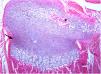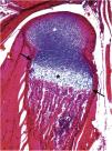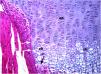 Growth plate. Frontal section of the tibia of a 6-week-old Wistar rat. In the continuous development of the chondroepiphysis, a hyaline cartilage structure is clearly visible and in which Cajal (1889) writes about cells in different phases of growth: proliferating, serial cells, atrophied cells, and large chondroplasm, etc. Years later, in the 20th century, this group of cells will become known as the growth plate, and three zones are described: the reserve or resting zone (zr), the proliferative zone (zp), and the hypertrophic zone (zh). T.I. Morales (2007) outlines the process of cell rotation in the isogenic groups of the growth plate and the formation of columns of cells, and establishes a formal connection between both processes (paraffin section 5μm, H&E 10×).