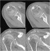 Imágenes de TAC. Se observa una lesión lítica cortical dependiente de la vertiente externa de la cabeza humeral con comportamiento expansivo, acompañada de un área osteocondensante periférica e hipodensidad periférica en relación con el edema óseo presente en la RM, presentando características radiológicas de agresividad local.