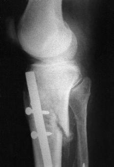 Figura 1. Rotura intraoperatoria de la cortical posterior de la tibia.Postoperatoriamente no hubo ningún síndrome compartimental, infección, embolia grasa o complicación neurológica. Dos pacientes desarrollaron distrofia simpaticorrefleja, tres presentaron un acortamiento de 6-10 mm y 13 pacientes (21%) desarrollaron dolor femoropatelar que desapareció al retirar el clavo. Todos los pacientes presentaron una movilidad completa de la rodilla. Hubo cuatro casos de rigidez del tobillo con falta del 20% de extensión. Sesenta pacientes (98%) volvieron a caminar sin claudicación y sin bastones y a subir escaleras normalmente. Todos ellos recuperaron su nivel de actividad previa a la fractura.