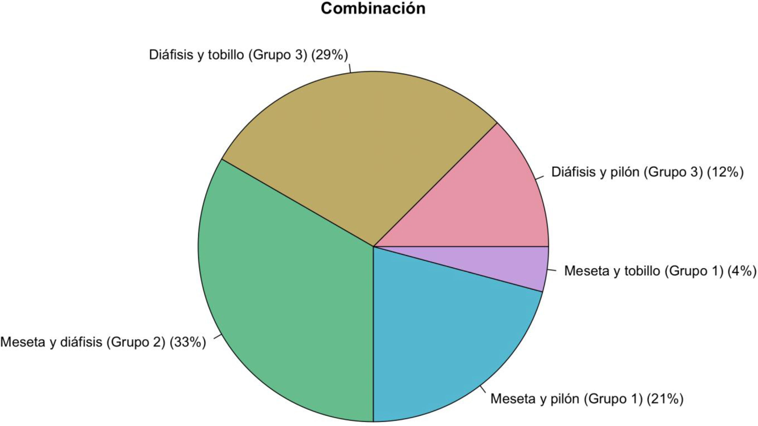 | Combinación tipo de fractura | Grupo 1: meseta + tibia distal (6 pacientes, 25%)Grupo 2: diáfisis + meseta (8 pacientes, 33%)Grupo 3: diáfisis + tibia distal (10 pacientes, 42%) |