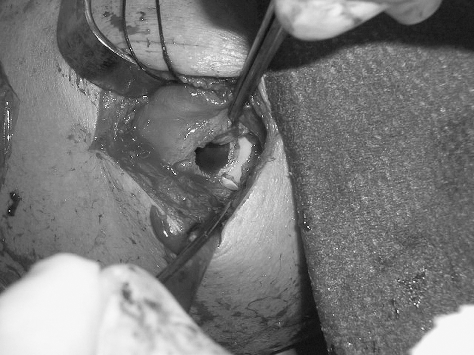 Figura 3. Visión craneal de un abordaje acromial anterolateral. Nótese el punto de entrada medial invadiendo varios milímetros el cartílago articular.