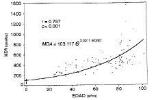 Resultados: En el análisis de regresión y ajuste rectilíneo/curvilíneo frente a la edad, sólo para MDA se obtuvo un coeficiente de regresión superior a 0,75 (p< 0,005). El mejor ajuste se obtuvo mediante una expresión exponencial, con la siguiente relación paramétrica: