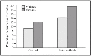 Figura 2.Porcentaje de apoptosis temprana en linfocitos procedentes de varones y mujeres, tras la incubación con péptido beta-amiloide. La apoptosis se determinó marcando linfocitos con anexina V antes y después de la incubación con beta-amiloide 10μM. Los histogramas corresponden a las medias de mujeres (n = 3) y varones (n = 3).