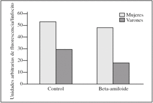 En cuanto a la cuantificación de organelas, hubo mayor número de mitocondrias en las muestras controles procedentes de mujeres. Así las mitocondrias de linfocitos en las mujeres presentaron una media de 53.000 ± 2.200 unidades arbitrarias de fluorescencia por linfocito frente a los varones que tienen 29.700 ± 15.400, con una significación estadística p = 0,06. Al añadir beta-amiloide se observó una disminución de mitocondrias del 9,4% en las mujeres frente al 37,4% en los varones (fig. 5).