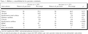 Los antecedentes de los pacientes de cada grupo se exponen en la tabla 1. No se encontraron diferencias entre ambos grupos salvo por la mayor presencia de insuficiencia cardíaca en el grupo de ancianos. También se aprecia una tendencia a una mayor proporción de pacientes con EPOC en este grupo.