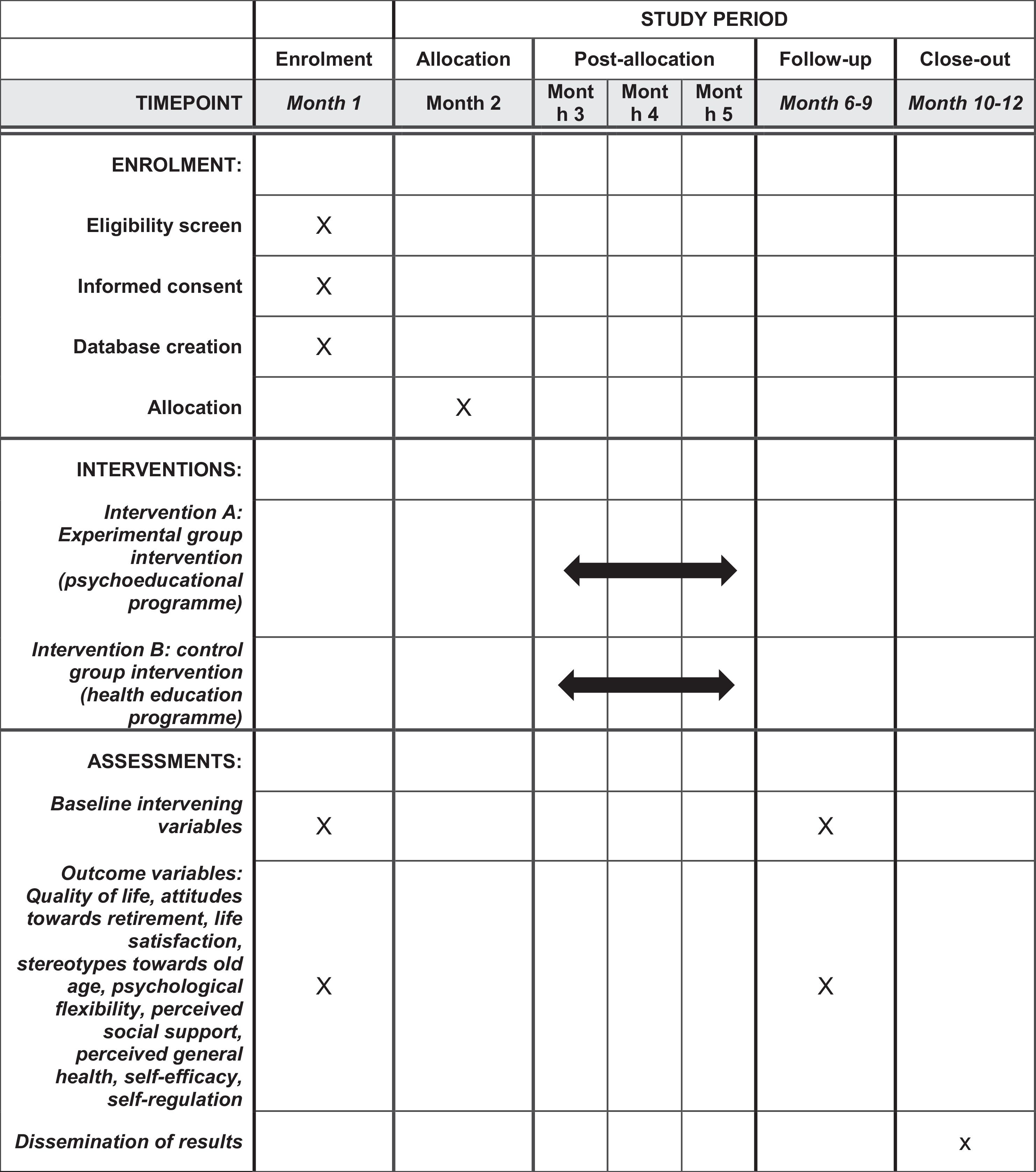 DiscussionThis protocol describes a comprehensive psychoeducational intervention aimed at improving quality of life and attitudes towards retirement, increasing life satisfaction, psychological flexibility, perceived social support and general health, self-efficacy and self-regulation, and reducing stereotypes about ageing.