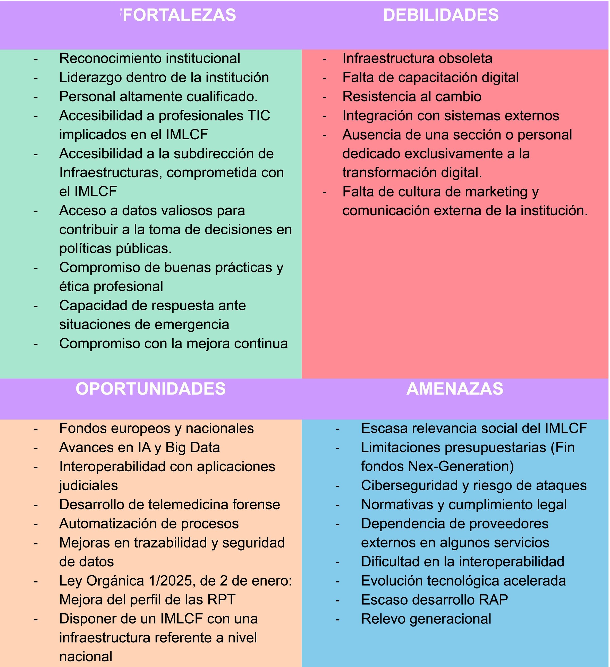 Digital transformation represents a strategic opportunity to modernize the Institutes of Legal Medicine and Forensic Sciences (IMLCF) and align them with the current challenges of the Administration of Justice. This article proposes a generalizable model to drive such transformation from a comprehensive perspective, not only technological but also organizational, cultural, and data-oriented. Based on an internal and external analysis of the institutional environment, which each institute must undertake, the main strengths, weaknesses, opportunities, and threats can be identified, as well as the possibilities that technological advances offer to legal medicine and forensic sciences. This diagnosis enables the definition of the digital strategic vision of each institute. A progressive roadmap is proposed, grounded in best practices and focused on leadership, staff involvement, and sustainability of actions. Digital transformation is not an end in itself but a means to deliver a more effective, human, transparent, and citizen-centered forensic public service.