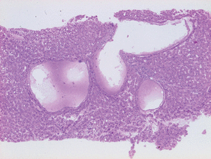 Figura 1. Tinción hematoxilina-eosina: cilindro hepático con dilataciones pleiotópicas.