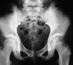 Figura 1. Radiografía de sacroilíacas. Se observa la sacroilíaca izquierda con márgenes irregulares y mal definidos.