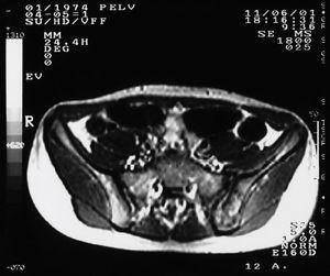 Niña de 12 años sin antecedentes médicos de interés, que presentó desde julio de 2001 episodios de fiebre alta de hasta 39 ºC, con dolor en la nalga izquierda irradiado hacia la cara posterior del muslo hasta la rodilla. Las crisis de dolor y fiebre fueron limitadas, de 3-4 días de duración, cedieron con tratamiento antiinflamatorio y se repitieron con periodicidad variable. En noviembre de 2001 la paciente presentó un cuarto episodio muy intenso, por lo que fue remitida a reumatología para su estudio. No presentó otra clínica acompañante. En períodos de intercrisis quedó un dolor residual de leve intensidad en la hemipelvis izquierda que no limitó las actividades diarias. La anamnesis por aparatos resultó anodina. La auscultación cardiopulmonar no evidenció alteraciones. La exploración física puso de manifiesto un abdomen blando y depresible sin masas ni megalias. La palpación profunda en la región lumboglútea izquierda fue dolorosa con maniobras positivas en la sacroilíaca izquierda. No se palpó tumoración de partes blandas. Las maniobras radiculares fueron negativas y los reflejos osteotendinosos estuvieron dentro de la normalidad.