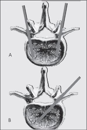 Figura 2. A: acceso transpedicular; es la vía de abordaje requerida para la realización de la cifoplastia (2 accesos). B: acceso laterotranspedicular; con un trayecto oblicuo es posible acceder a la región central del cuerpo vertebral, con esta técnica se evita una punción al paciente y se acorta el tiempo del procedimiento.