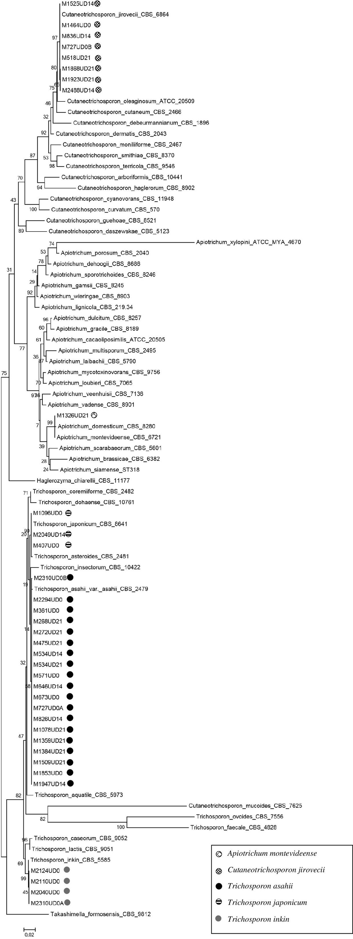 Table 1 presents the identification results of the strains included in this study. Molecular identification showed 100% concordance with MALDI-TOF results, as revealed by the phylogenetic analysis (Fig. 1). T. asahii was the predominating species (19/35, 54.29%), followed by C. jirovecii (8/35, 22.86%), T. inkin (4/35, 11.43%), Trichosporon japonicum (3/35, 8.57%) and A. montevideense with one positive culture (1/35, 2.86%). Two urine cultures of two samples from one patient (after 14 and 21 days of hospitalization) yielded T. asahii. Two patients had two different Trichosporon species isolated from a single urine sample collected at admission (Table 1).