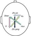 Se muestra el orden de punción de las bandas que corresponden a las actividades espirituales iniciando en Madera (círculo verde), que corresponde con actividad espiritual 魂 (Hun); continuando con Fuego (círculo rojo), que corresponde a Shen; posteriormente Tierra (círculo amarillo), que corresponde a 意 (Yi); a continuación Metal (círculo blanco), que corresponde a 魄 (Po), y finalmente Agua (círculo negro), que corresponde a 志阴 (Zhi Yin) y 阳 (Zhi Yang). Así también se ubican los síntomas de depresión que puede tratarse con cada banda.
