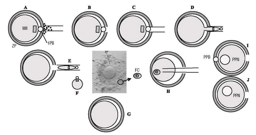 Figura 3. Transferência nuclear de uma célula folicular para um ovócito MII enucleado, seguida de activação. (A,B) Abertura de orifício na zona pelúcida (ZP) com Tirode ácido. (C-E) Enucleação em meio com citocalasina B. Aspiração do 1.o glóbulo polar (1PB: 1N2C) e do ooplasma subjacente, contendo os cromossomas femininos em metafase II (MII: 1N2C), libertando o carioplasto (F) e o ooplasto (G). (H) Transferência nuclear de uma célula folicular (FC, célula somática adulta do ovário, diplóide: 2N,1C) para o ooplasto. (I) A activação, em meio sem citocalasina B e com 5 µM ionomicina (ionoforo de cálcio), induz haploidização, com expulsão de um pseudo-glóbulo polar (PPB: 1N1C) e formação de um pseudo-pronúcleo haplóide (PPN: 1N1C). (J) A activação, em meio com citocalasina B, 5 µM ionomicina e 2.5 mM 6-dimetilaminopurina (6DMAP: inibidor da síntese proteica, que impede a citocinese), induz diploidização, formando-se um pseudo-pronúcleo diplóide (PPN: 2N1C) por não existir extrusão de um pseudo-glóbulo polar.
