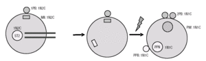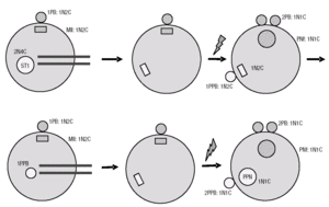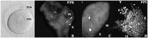 Do mesmo modo, no ratinho (fig. 2), após a microinjecção de um espermatócito primário (em profase I da meiose, ST1: 2N4C) num ovócito MII (1.o glóbulo polar, 1PB: 1N2C; MII: 1N2C), o ooplasma rico em MPF actua sobre o DNA do ST1, condensando os cromossomas e a eles associando um fuso. Cerca de 2 h depois da transferência nuclear, procedeu-se à electroactivação do constructo. Em 50% dos casos, o fuso MII do ovócito segregou os cromatídeos e o fuso MI do ST1 segregou os cromossomas homólogos. Deste modo, observou-se a extrusão do 2.o glóbulo polar feminino (2PB: 1N1C) e a formação do pronúcleo feminino haplóide (PNf, 1N1C). Por parte do ST1, houve extrusão de um 1.o pseudo-glóbulo polar (1PPB: 1N2C) e formação de um pseudo-pronúcleo, ainda diplóide (cada cromossoma com dois cromatídeos, PPN: 1N2C). O 1PPB masculino foi então microinjectado noutro ovócito MII. O ooplasma rico em MPF actuou sobre o DNA masculino (2 h), condensando os cromossomas e a eles associando um fuso. Após electroactivação, em 50% dos casos, os dois fusos segregaram os cromatídeos, com extrusão do 2PB (1N1C) e formação do PNf (1N1C) por parte do ovócito, e extrusão do 2PPB e formação de um PPN haplóide (1N1C) por parte do ST1. Dos zigotos, 12% atingiram o estádio de blastocisto. Após transferência, originaram descendência em 0,8% (2/258) dos casos, tendo os animais morrido pouco após o nascimento.