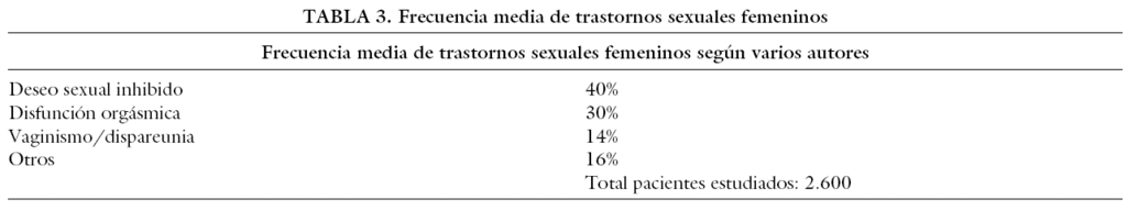 La frecuencia real de este tipo de problemas entre la población general es difícil de conocer, aunque la mayoría de los autores que ha estudiado el tema parece situarla, para el conjunto de las disfunciones sexuales, en el 35% en el caso de las mujeres y al menos en el 40% en el caso de los hombres1,4 (tabla 3).