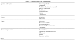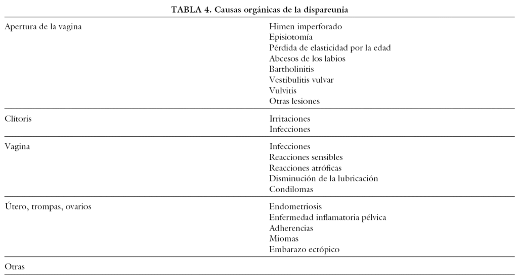 A veces la causa se encuentra más profunda en la vagina (vagina corta, estrechez vaginal media, cistitis intersticial o uretritis) o en la pelvis (enfermedad inflamatoria pélvica, adherencias pélvicas, endometriosis, útero fijo en retroversión, enfermedad inflamatoria intestinal, colon irritable, miomas uterinos, adenomiosis, etc.). En la tabla 4 se resume algunas de las principales causas orgánicas de la dispareunia13.