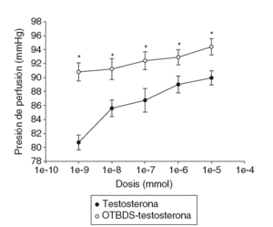 Por otro lado, se realizaron experimentos donde se evaluó el efecto inducido por testosterona y el derivado OTBDS-testosterona sobre la presión de perfusión (fig. 3). Los datos encontrados de la evaluación del efecto ejercido por la aplicación de testosterona (1 3 109 a 1 3 105 M) muestran un aumento en la presión de perfusión, sin embargo en comparación con el efecto ejercido por el OTBDS-testosterona este efecto se incrementa significativamente (p = 0,005).