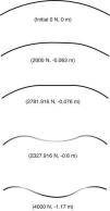 Cuando el arco es cargado puntualmente en su punto central (correspondiente al nodo más alto) con una carga de 6.6N el método implícito empieza a diverger en la cuarta iteración. En ese momento, el flujo explícito es automáticamente iniciado (véase tabla 3 para mayor detalle). Sobre el campo de desplazamientos representado sobre la configuración original, véase la figura 12.