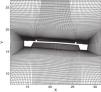 Na análise aerodinâmica utilizam‐se 2 tipos de modelos seccionais: um modelo, denominado Configuração I, caracterizado pela presença de guarda‐rodas maciços e guarda‐corpos pré‐moldados (detalhes que foram considerados no modelo numérico), enquanto o outro modelo, denominado Configuração II, possui guarda‐rodas vazados e guarda‐corpos em cercado aramado (sendo que este último detalhe não foi considerado no modelo numérico). Na análise aeroelástica é empregada a segunda configuração, porém com uma inclinação das paredes internas das longarinas mais acentuada, sendo este modelo denominado Configuração III. Adotou‐se nas análises, como critério para a malha de elementos finitos, um tamanho mínimo de elemento igual a 1% da dimensão característica do corpo sólido (no caso, a largura da ponte). Entretanto, a dimensão mínima do elemento indicada acima foi reduzida ainda mais para atender a detalhes geométricos das barreiras Jersey e cercas de proteção. A malha de elementos finitos referente à Configuração I tem 23.324 elementos e 23.775 nós com a menor dimensão na ordem de 0,02m. Para a Configuração II a malha tem 19.762 elementos e 20.117 nós e a menor dimensão de malha também ficando por volta de 0,02m. Finalmente, para a Configuração III tem‐se 21.504 elementos, 21.894 nós com a menor dimensão encontrada de 0,01m. Apenas esta última malha é apresentada na figura 5. Como pode se notar, a seção está deslocada verticalmente e possui também um giro inicial (o que também é feito quando se realiza a análise experimental). Isto se deve aos procedimentos de análise usados em problemas de instabilidade.
