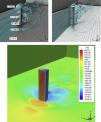 Os dados são comparados com aqueles obtidos da análise experimental em túnel de vento e apresentado por Rocha et al. [2]. Como se observa, há uma muito boa concordância entre os trabalhos para o coeficiente de arrasto. Já para o coeficiente de sustentação os resultados mostrados são mais próximos para ângulos de ataque negativos com uma diferença na ordem de 35% para ângulos positivos. Por fim, para o coeficiente de torção, tem‐se uma excelente conformidade entre os resultados para incidência do escoamento positiva, porém verifica‐se uma diferença significativa para ângulos negativos. Quanto às diferenças observadas para a sustentação, poder‐se‐iam justificar através do modelo de turbulência usado onde, devido à grande extensão do corpo imerso, um esquema clássico de Smagorinsky poderia se mostrar insuficiente, sendo que com o uso de um modelo dinâmico, de forma que o coeficiente de Smagorinsky possa variar tanto no espaço como também no domínio do tempo, o mesmo poderia se ajustar aos diferentes regimes de escoamento encontrados na região do corpo imerso. Também podem ser citados como causa destas diferenças alguns aspectos geométricos, como a descrição dos guarda‐corpos, que por sua vez podem ser mais bem representados através de um código tridimensional. Vale lembrar também que ensaios experimentais em túneis de vento não são isentos de erros, já que os dispositivos de medida, bem como as paredes do túnel, podem influenciar consideravelmente os resultados.