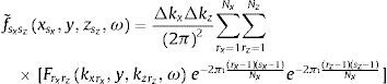 donde s=1, …, Nx; Δkx es el incremento en el número de onda kx; Nx es el número total de puntos necesarios para poder realizar eficientemente la transformada inversa y Δx=2π(Nx−1)Δkx. Para acelerar el tiempo de cálulo se emplea el algoritmo correspondiente a la transformada rápida de Fourier.De modo análogo, es necesario realizar la doble transformada inversa de Fourier para las variables kx y kz para obtener la SF en el semiespacio 3D. Su expresión analítica viene dada por: