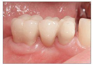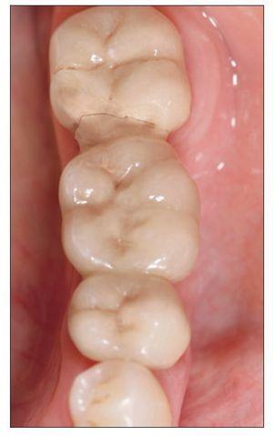 Figura 3 Ejemplo de una PDF en la que la carilla de cerámica se fracturó a los 33 meses de funcionamiento y el armazón resultó expuesto (paciente 6 de la tabla 1). La PDF se reparó con una carilla de cerámica glaseada unida con resina.
