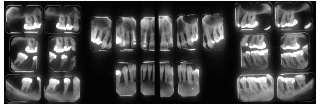 Figura 1 Radiografías periapicales realizadas en 1989 a una mujer de 31 años que muestran una amplia pérdida de hueso vertical como consecuencia de una enfermedad periodontal avanzada.