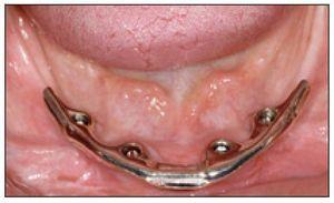 Veinte pacientes con maxilar inferior edéntulo fueron tratados de forma consecutiva con 4 implantes intraforaminales. Los implantes (Brånemark System, Nobel Biocare; Standard Implant, Straumann) se colocaron en la región del primer premolar y el segundo incisivo en ambas zonas del maxilar inferior y cicatrizaron de forma sumergida durante un mínimo de 3 meses. Los grupos Straumann y Brånemark formados cada uno por 10 pacientes se dividieron aleatoriamente en 2 subgrupos de 5 participantes. Estos subgrupos recibieron una superestructura de barra convencional o CTiP pasivada (figuras 1 y 2). Un paciente del grupo Brånemark convencional perdió un implante durante el período de cicatrización, y la barra se montó sobre 3 implantes. Se fabricaron cubetas de impresión personalizadas utilizando placas de resina fraguadas por luz (Palatray XL, Heraeus Kulzer). Después de la inserción de las cofias de impresión de los implantes se utilizó un poliéter (Impregum Penta, 3M, ESPE) para la impresión pick-up (técnica de la cubeta abierta). La réplica laboratorial del implante se unió a las cofias y se fabricó un modelo maestro con reproducción gingival de silicona.