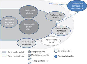 El diagrama permite analizar las interrelaciones que se van produciendo en los intentos de regular los diversos tipos de trabajo. Por un lado se evidencia que la protección del trabajo asalariado sigue siendo uno de sus ejes identificadores.