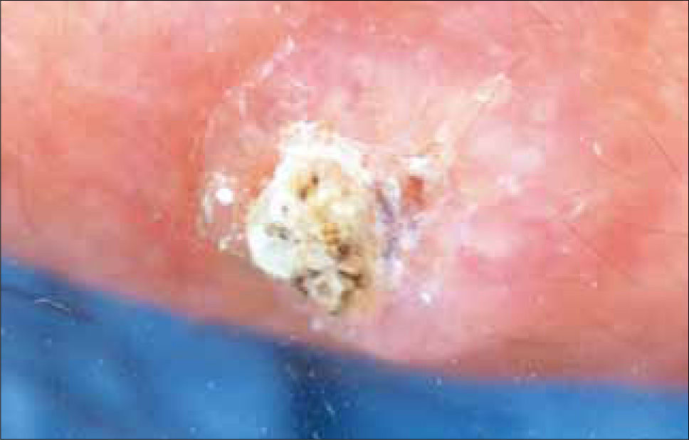 4) Quístico: la degeneración quística de un CB a veces es solo un hallazgo en la histopatología, por lo que clínicamente solo puede tener el aspecto de basocelular nodular o el de una lesión azul grisácea translucida de aspecto quístico, que al puncionarla puede dar salida a un líquido claro (Figura 4) (20).