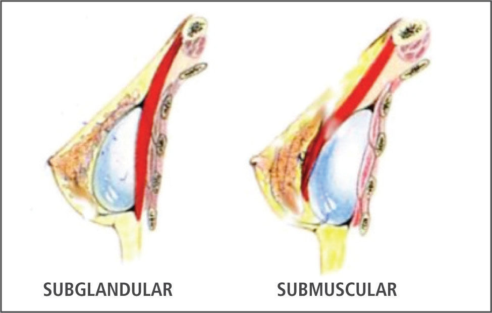 Colocación subglandular:Puede disminuir el tiempo de cirugía de aumento y reducir el tiempo de recuperación. Una posible desventaja podría ser que los bordes del implantes se vieran más a través de la piel. La obtención de imágenes durante una mamografía también puede ser más difícil cuando los implantes se colocan bajo las glándulas. Figura 1.