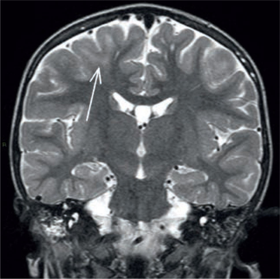 Paciente con displasia cortical. Imagen coronal potenciada en T1 de alta resolución, segmentada. (FreeSurfer, Martinos Center for Biomedical Imaging, v4.5.0). Pseudo adelgazamiento focal de la corteza frontal, secundario a la falta de diferenciación entre la corteza y la sustancia blanca (flecha).