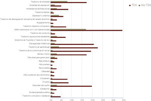 Prevalencia de comorbilidad en niños con trastorno del espectro autista (TEA) (en rojo) y hermanos sin TEA (en verde)6.
