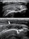 Ecografía de codoLas alteraciones más frecuentemente diagnosticadas en esta articulación son: Epicondilitis-codo del tenista (tendinopatía extensora), Epitrocleítis-epicondilitis medial- codo del golfista (tendinopatía flexora), derrame articular ya sea de origen inflamatorio o asociado a fracturas ocultas (figura 6), neuropatía cubital ya sea por atrapamiento o luxación, bursitis olecraneana (figura 7), tendinopatía tricipital, del biceps distal y su bursa, lesiones por elongación del ligamento colateral cubital, quistes/gangliones periarticulares, prominencias en rebordes óseos articulares, calcificaciones y entesopatía (14, 15).