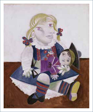 En 1938 el artista retrató a su hija Maya, que nació de la relación que mantuvo con Marie-Thérèse Walther, su compañera entre 1927 y 1944, llegando a convertirse en la mujer con quien más tiempo mantuvo una relación de amor. En la pintura, bautizada como “Maya con muñeca”, se ve a la niña de tres años jugando con una muñeca, quedando de manifiesto el cubismo en la deformidad de su rostro y en la combinación de lo frontal de sus ojos con el perfil de su boca y nariz. Queda en evidencia también, en los planos geométricos trazados en las piernas y en la falda de Maya.