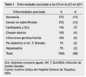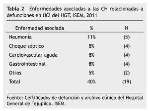 Las enfermedades de base o asociadas a las CH fueron las infecciosas 54% (n 26) y no infecciosas 21% (n 10) (tabla 1). En este caso, su mortalidad se registró del 40% (n 19). Su edad media fue 56 ± 17 años y predominó en el sexo femenino con relación de 2:1 (tabla 2). En el 25% (n 12) hubo enfermedades asociadas o no se identificaron. Los dÃas de estancia en la UCI se reportaron de uno a 20, siendo su media de 5±4.