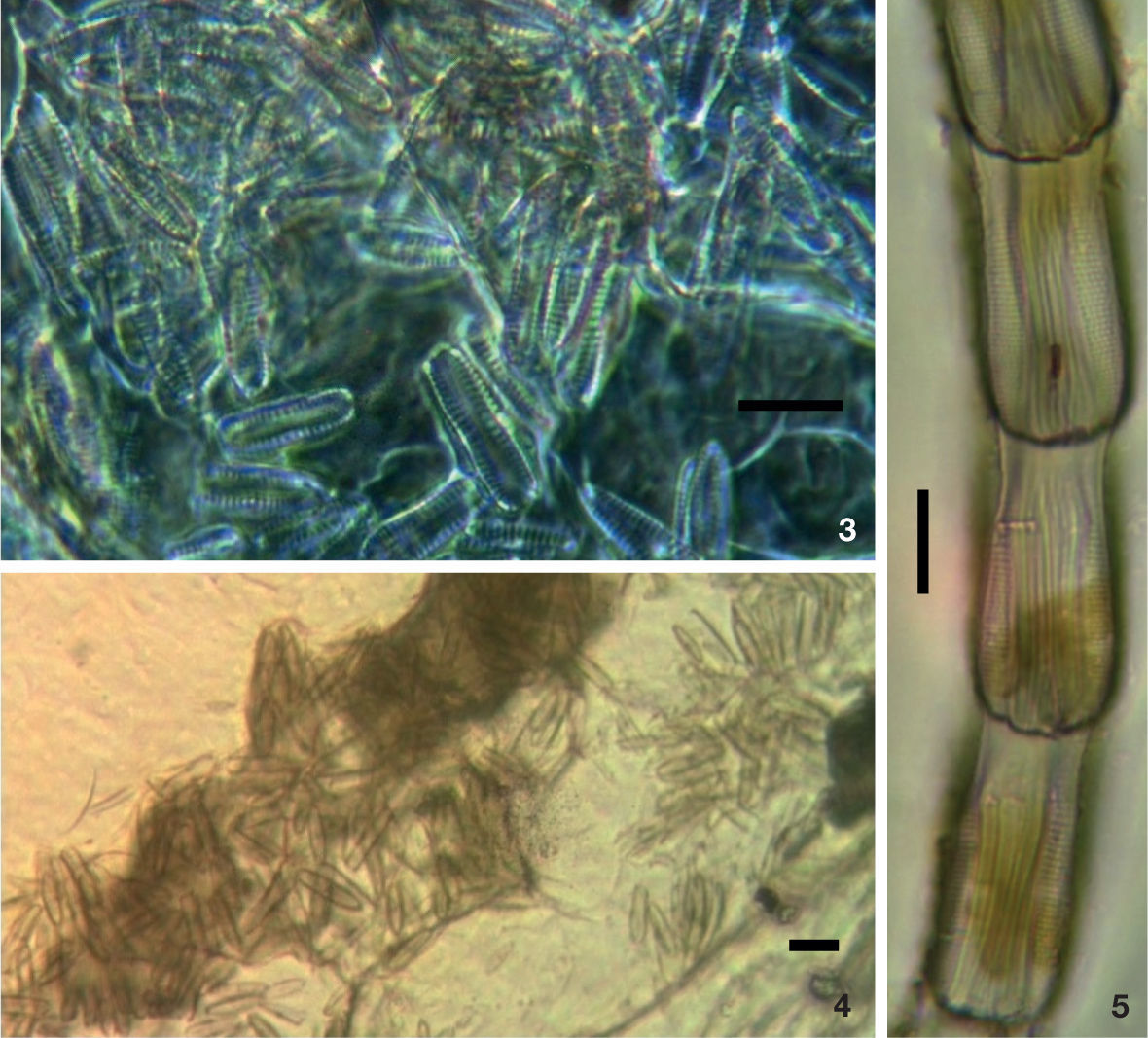 Diatomeas en contenidos intestinales de Haliotis spp. en la costa oeste de la península de Baja California. 3: cúmulo de Navicula cincta entre los contenidos intestinales de Haliotis spp., después de la oxidación con ácido nítrico (1000×); 4: misma, pero a 400×; 5: fragmento de una cadena de Parlibellus hamulifer. Barra= 10 μm.