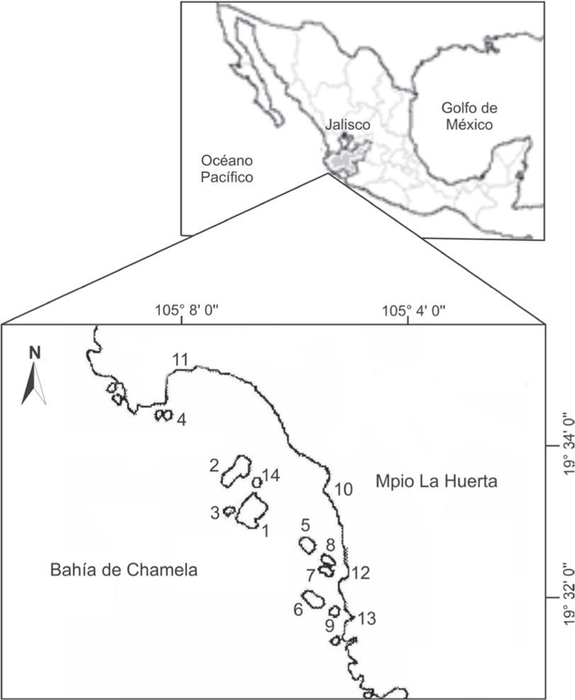 Localización de bahía Chamela y de los sitios de muestreo: 1, isla Cocinas; 2, isla Pajarera; 3, islote El Mamut; 4, islotes Los Anegados; 5, isla La Colorada; 6, isla San Andrés; 7, isla San Pedro; 8, isla San Agustín; 9, isla Negra; 10, La Rosada; 11, Punta Pérula; 12, Chamela; 13, playa Negritos; 14, El Novillo.