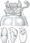 Passalus (Pertinax) rzedowskiorum n. sp. (Fig. 2)Description: habitus: midsize, total length 26.0–35.8mm, hemibrachypterous, body convex shiny black. Head: labrum with anterior border slightly concave, covered with scarce setae that are less dense anteromedially. Clypeus hidden under the frons, with anterior angles reduced, placed under the mediofrontal tubercles, smaller than mediofrontal tubercles. Frons wide, anterior frontal edge with light or strong medial indentation (notched), without secondary mediofrontal tubercles. Mediofrontal tubercles projected forward, larger than inner tubercles. Inner tubercles conical, projected upwards, joined to mediofrontal tubercles by a weak ridge, placed at mid distance between the mediofrontal tubercles and the central tubercle apex. Posterofrontal ridges “V” shaped. Area between frontal ridges heavily punctate on the anterior half. Cephalic mamelon (sensuJiménez-Ferbans & Reyes-Castillo, 2014) present and whole. Mesofrontal structure of the “marginatus” type (Reyes-Castillo, 1970), with central tubercle wide at the base, without a sulcus posteriorly, apex not free. Lateroposterior tubercles marked. Lateropostfrontal areas glabrous, shiny, and mostly impunctate, but with conspicuous striae. Eyes reduced, with canthus covering 2/3 of the eye in lateral view. Canthus glabrous. Postfrontal groove complete with an inverted “V” at the mid-part. Hypostomal process slightly separated from mentum, glabrous and reaching the upper part of the mid zone of the mentum. Medial-basal mentum protruding ventrally, pubescent on the posterior half. Mentum with big lateral fossae, deep and glabrous. Antennal club trilamellate, with short lamellae. Mandibles tridentate on the apex, with teeth of similar size. Internal tooth of the left mandible bidentate, simple on the right mandible. Dorsal tooth straight in dorsal view and slightly concave in lateral view. Dorsal mandibular pubescence covering the base of the mobile tooth and reaching the base of the internal tooth. Mandibular fossae covering entirely the base of the mobile tooth. Maxilla with lacinia bidentate at the apex. Ligula tridentate, with middle tooth longer and lateral teeth reduced. Middle palpomere of the labial palp 1.5 times wider and with almost the same length as the distal palpomere.