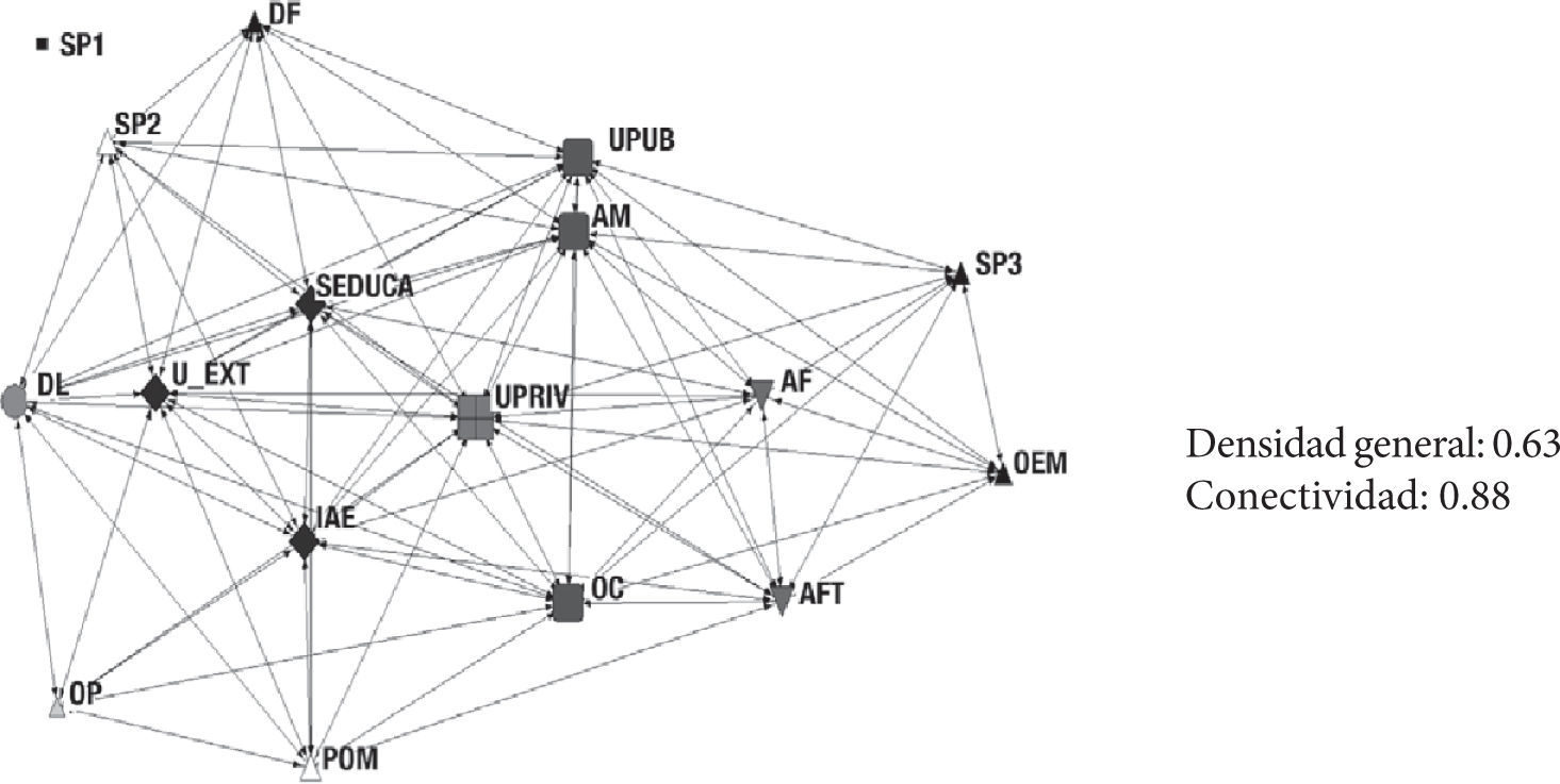 Los índices de densidad y de conectividad (betweenness) son dos indicadores muy útiles para conocer las características estructurales de cualquier red. El primero sirve para medir la intensidad de tránsito en una red y puede variar de 0 a 1. Una gráfica totalmente densa tendría un índice de 1, lo cual significa que todos los puntos están conectados entre sí, mientras que un índice igual a 0 implica que los nodos se encuentran aislados unos de los otros sin relación alguna. El segundo también varía de 0 a 1 e informa sobre la facilidad que existe para circular entre los distintos puntos de la gráfica. Una gráfica con un índice de concectividad de 1 significa que es muy fácil acceder a los distintos elementos de la red, independientemente de la posición de partida es sencillo desplazarse hacia cualquier otro punto de la red mientras que un índice igual a 0 indica que no hay red, en la medida que no hay posibilidades de conexión.