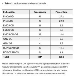 Al 67.6% (117) de los pacientes se les indicó bevacizumab en la consulta. El 72.9% (97) de los pacientes con más de 10 años de DM entraron en ese grupo. De los pacientes a los cuales se les indicó bevacizumab, el 82.9% tenían más de 10 años de diabetes.