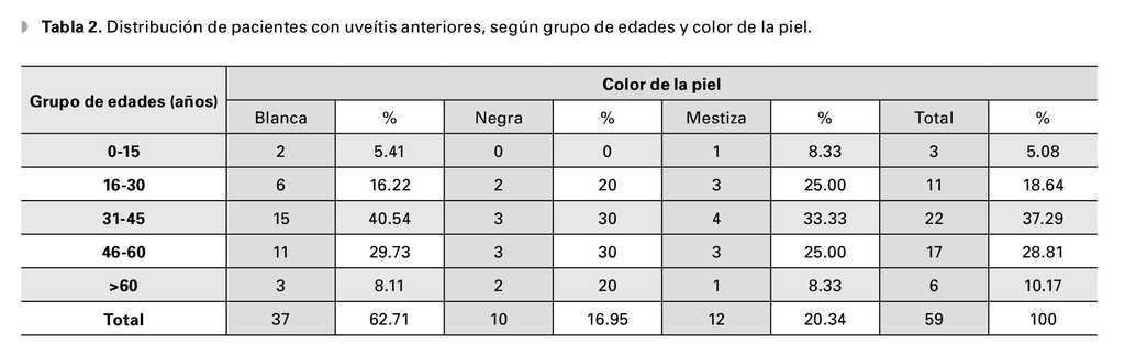 Resultados: Predominó la uveítis anterior en el sexo femenino (69.49%), de 31-45 años (37.29%) y color de piel blanca (62.71%). La uveítis anterior de causa idiopática se presentó en el 44.07%, siendo más frecuente el curso clínico agudo (59.72% de los pacientes). El 77.97% de los brotes fueron unilaterales. La complicación más frecuente fue la presencia de sinequias posteriores con un 36.11%.