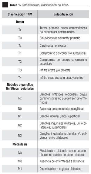 La vía de diseminación inicial es a través de los vasos linfáticos del prepucio a los ganglios inguinales superficiales y profundos; ya que el glande y uretra drenan a los ganglios inguinales externos profundos. Las metástasis a órganos sólidos por vía hematógena se presenta en menos de 10% de los pacientes, siendo los sitios más frecuentes de metástasis: pulmón, hígado y huesos. Existen varias clasificaciones del estadiaje clínico, la más utilizada en la literatura es la de TNM (Tabla 1).