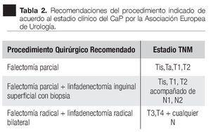La Asociación Europea de Urología propone que el éxito terapéutico está relacionado con el tratamiento del tumor primario mediante una falectomía parcial o radical, acompañada de una linfadenectomía radical uni o bilateral de acuerdo a la estatificación clínica de los nódulos linfáticos (Tabla 2).11,12 Las modificaciones que se han reportado en la literatura para realizar una linfadenectomía parcial, buscan disminuir la morbilidad asociada a la extensión de la disección y la desvascularización de la piel, que provocan la necrosis cutánea, infección, linfedema y deformidad (30% a 50%).13,14