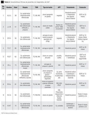 En la mayoría de casos, el tratamiento de elección fue falectomía parcial en siete pacientes (tres con linfadenectomia inguinal): a dos se les realizó una falectomía radical con linfadenectomía y uno se manejó con radioterapia y quimioterapia con Polisorbato de Docetaxel debido al estadio avanzado T3N3, falleciendo a los seis meses de su diagnóstico. El seguimiento es limitado debido a que la mayoría de los pacientes no acuden a la consulta externa, de los ocho pacientes vivos, uno presentó una fístula linfática y metástasis linfáticas que se manejaron con radioterapia con control de ambas y falleció tres años posteriores a su manejo inicial. Los seguimientos fueron muy variables, de dos a 53 meses con un promedio de 20 meses. En la Tabla 3 se muestran las principales características clínicas de todos los pacientes.