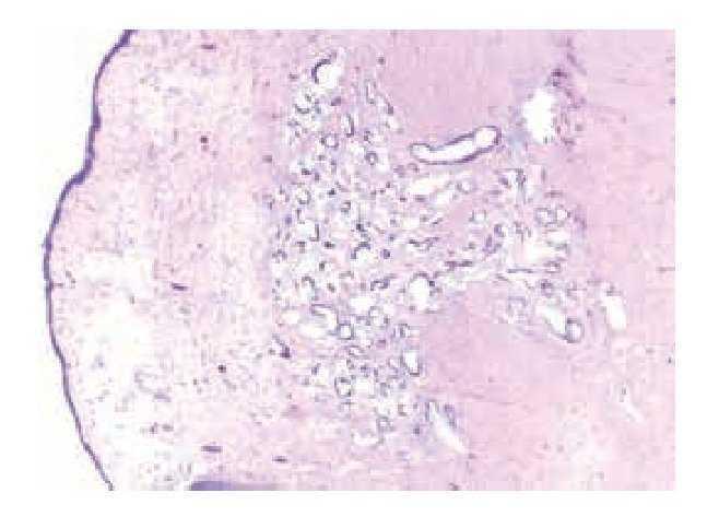 Se realizó resección transuretral del tumor vesical. El estudio histopatológico confirmó el diagnóstico de adenocarcinoma no uracal de vejiga asociado a cistitis glandularis y metaplasia escamosa. Posterior a la Resección Transuretral de Vejiga (RTUV), se realizó el mapeo vesical el cual se encontró sin alteraciones. En la endoscopia y colonoscopia no identificaron lesiones tumorales. El tratamiento realizado fue cistectomía parcial con linfadenectomía pélvica bilateral (Figura 2). El diagnóstico postoperatorio final fue de adenocarcinoma ulcerado, no uracal, de tipo entérico de 2 cm, con bordes quirúrgicos negativos a cáncer, siete ganglios derechos y siete izquierdos sin actividad neoplásica (Figura 3). Área de uraco negativa a neoplasia.