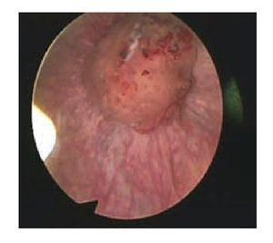 Figura 1.Cistoscopia que muestra lesión tumoral única en domo vesical con bordes irregulares de 1 x 1 cm y moco en la pared.