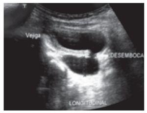 Figura 1.Ultrasonido con evidencia del divertículo proveniente de vejiga, con cuello de divertículo ubicado en piso vesical.