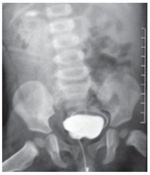 Fue recibido en el Instituto a los cinco meses de edad, durante esta visita se realizó ultrasonido renal y vesical, observando un gran divertículo vesical a la izquierda de la vejiga, cuyo tamaño era de dimensiones similares a la vejiga (Figura 1). La uretrocistografía confirmó el hallazgo del ultrasonido (Figura 2).